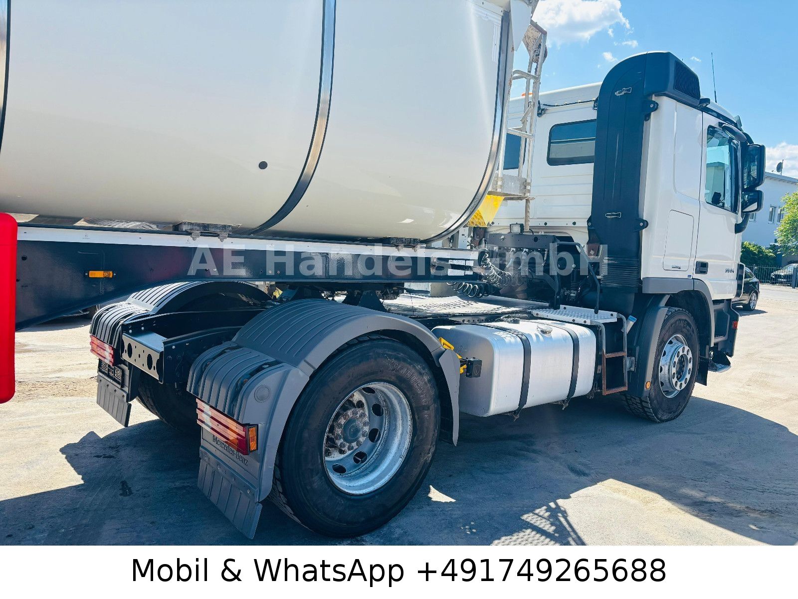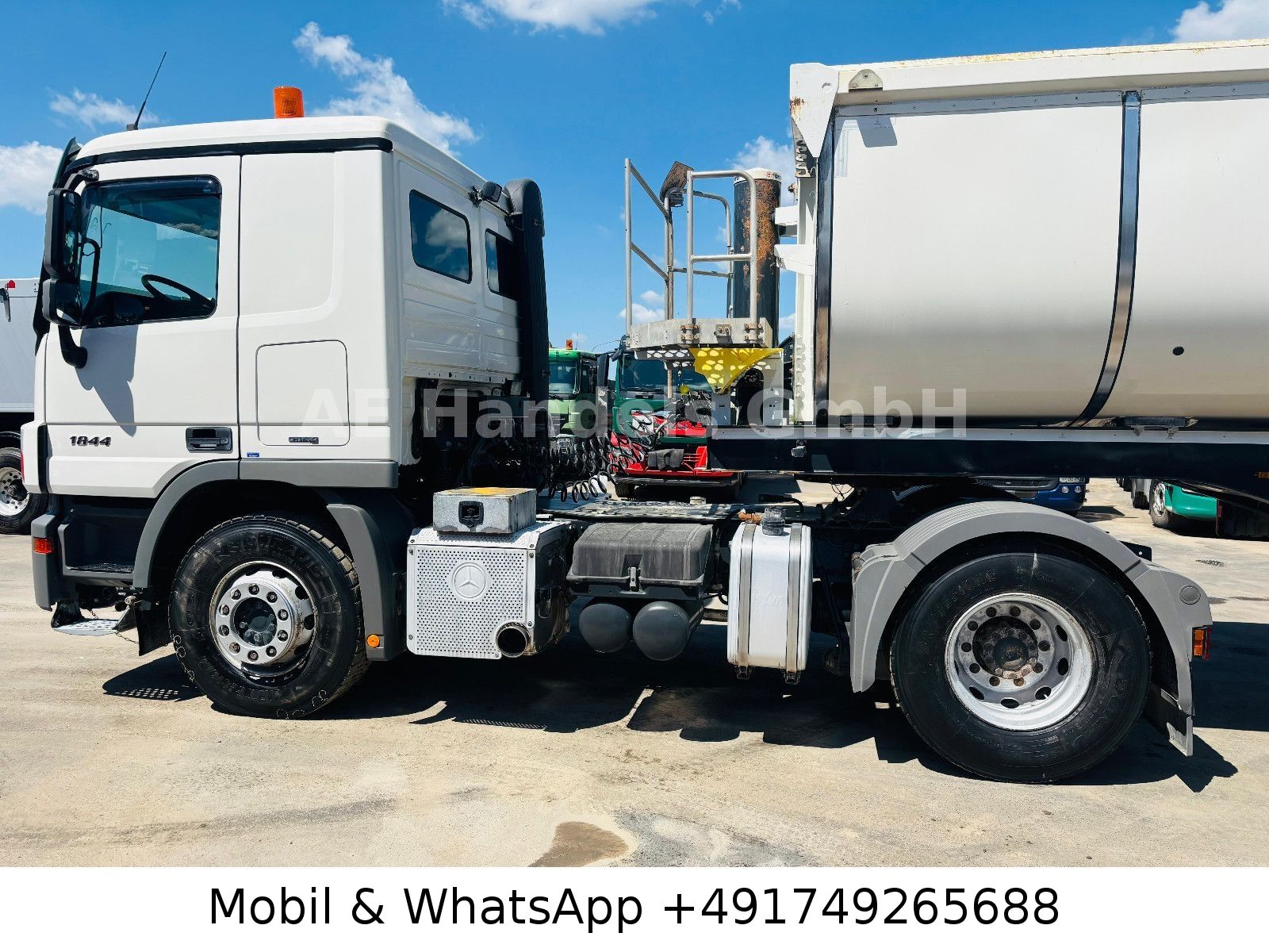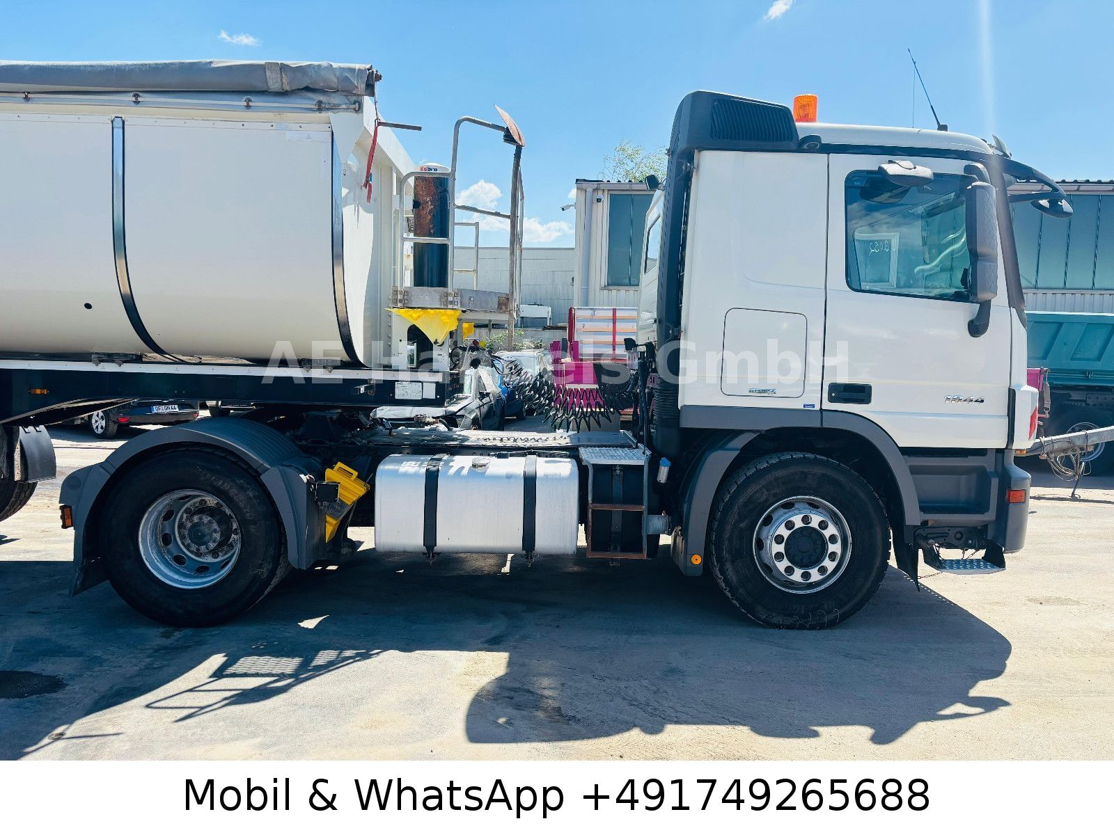 Emission standard EURO 5, axle configuration: 4×2, trailer socket 24V / 15-pole, electrically adjustable and heated exterior mirrors, wide-angle exterior mirrors and heated, left, outside temperature display, differential lock rear axle, aluminum air tank, cab: L (long), suspension: leaf / air, electric windows, 80 A generator, rear axle H 6, crown wheel 440, hydraulic pump (Meiller pump – 6 pistons), interior filter: pollen filter, body / structure: tractor unit, fuel tank: 400 Ltr. aluminum, additional air compressor, heated air drier, model upgrade from 06/2008, engine 12.0 L – 320 kW V6 diesel (OM 501 LA), engine brake with constant throttle, engine fan: Linning, secondary drive MB 2C, wheelbase 3600 mm, side spare wheel lift, rear window, fifth wheel coupling: construction height 150 mm, disc brakes, steel wheels 9.00×22.5, Telligent transmission, Telligent brake system with ABS + ASR, Telligent stability control, rear underrun protection foldable, CB radio preparation, phone/fax preparation, front axle straight, immobilizer, central locking including key, permissible total weight 18.00 t.