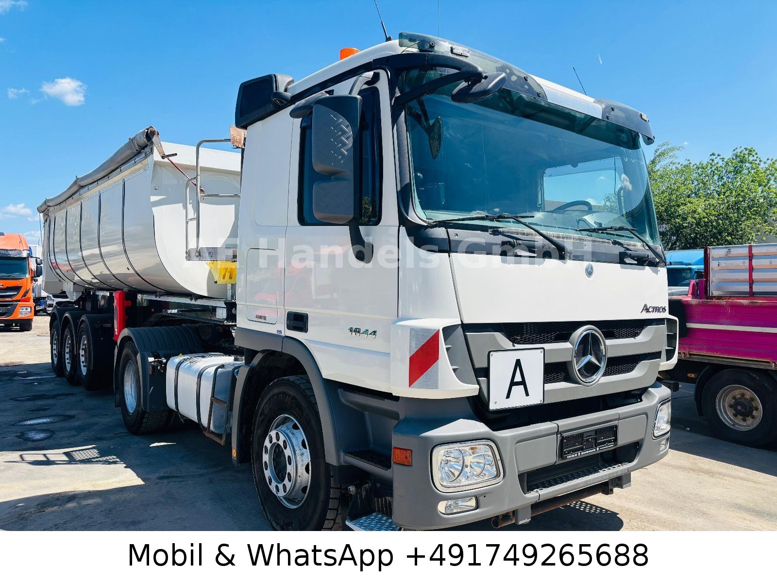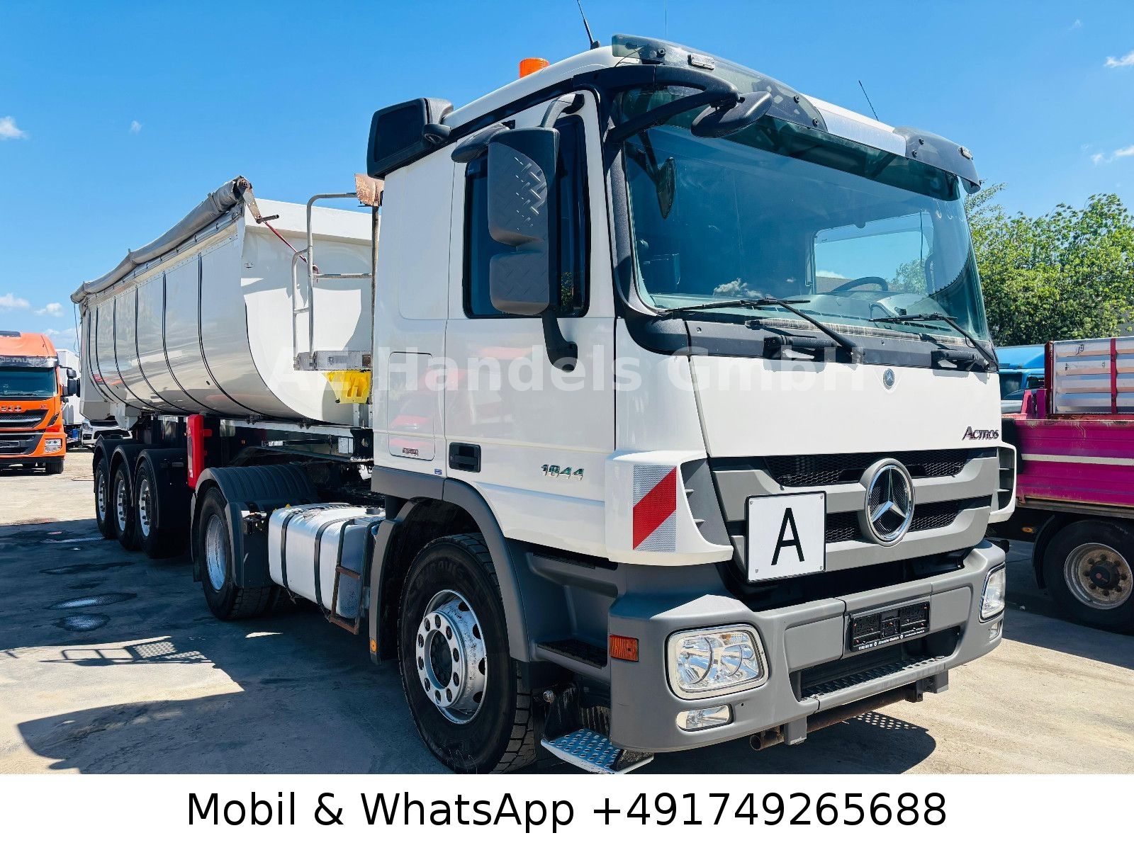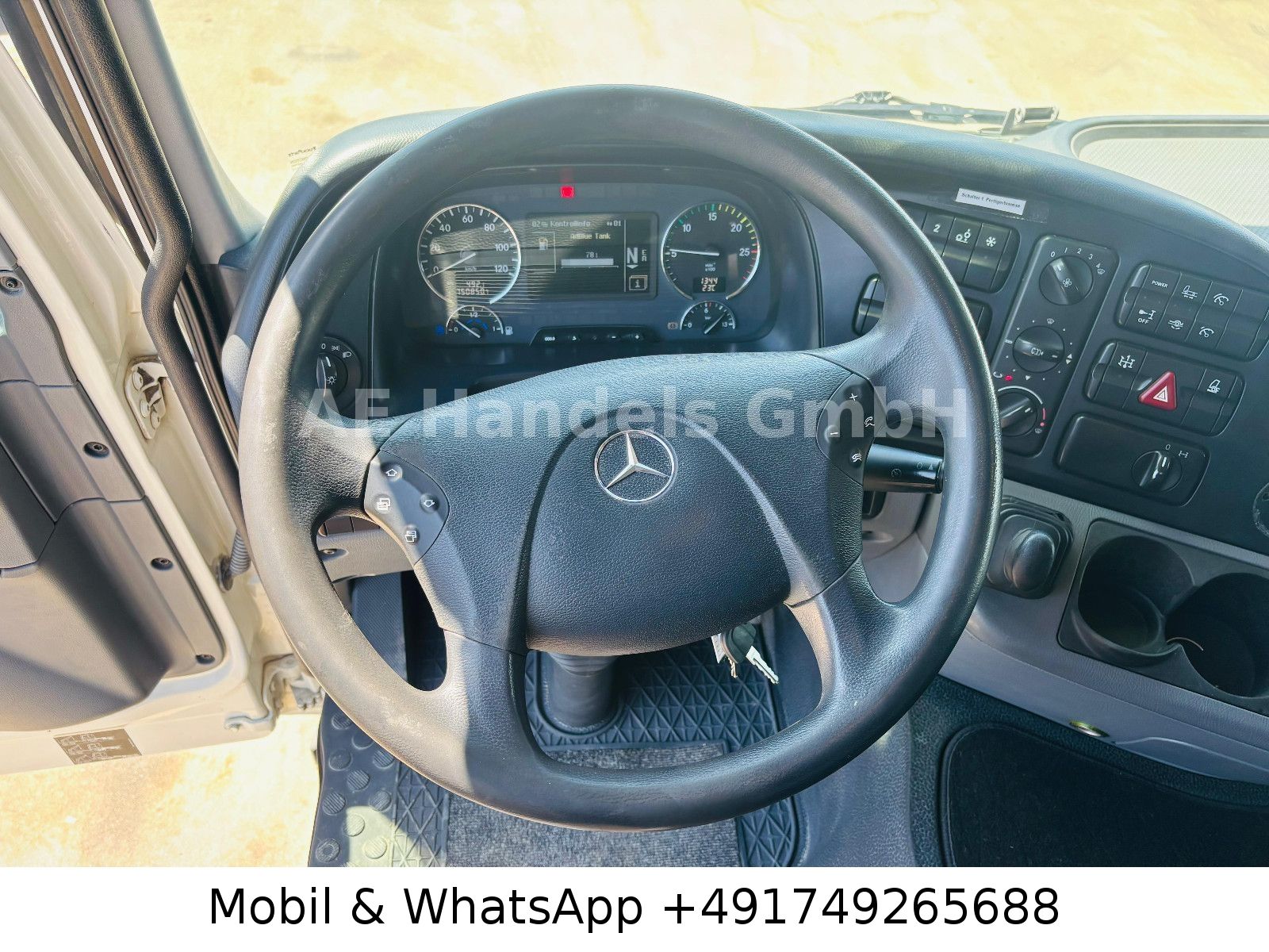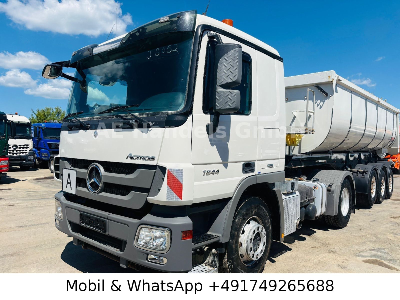Emission standard EURO 5, axle configuration: 4×2, trailer socket 24V / 15-pole, electrically adjustable and heated exterior mirrors, wide-angle exterior mirrors and heated, left, outside temperature display, differential lock rear axle, aluminum air tank, cab: L (long), suspension: leaf / air, electric windows, 80 A generator, rear axle H 6, crown wheel 440, hydraulic pump (Meiller pump – 6 pistons), interior filter: pollen filter, body / structure: tractor unit, fuel tank: 400 Ltr. aluminum, additional air compressor, heated air drier, model upgrade from 06/2008, engine 12.0 L – 320 kW V6 diesel (OM 501 LA), engine brake with constant throttle, engine fan: Linning, secondary drive MB 2C, wheelbase 3600 mm, side spare wheel lift, rear window, fifth wheel coupling: construction height 150 mm, disc brakes, steel wheels 9.00×22.5, Telligent transmission, Telligent brake system with ABS + ASR, Telligent stability control, rear underrun protection foldable, CB radio preparation, phone/fax preparation, front axle straight, immobilizer, central locking including key, permissible total weight 18.00 t.
