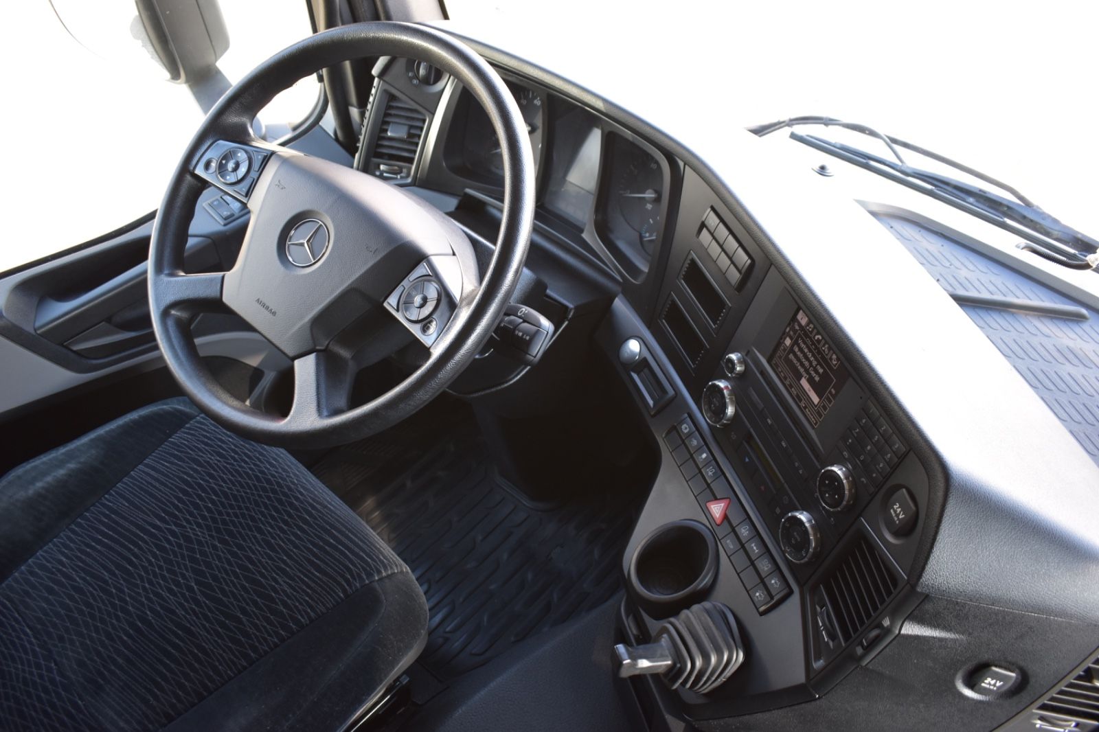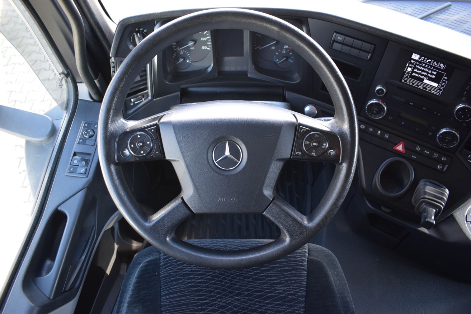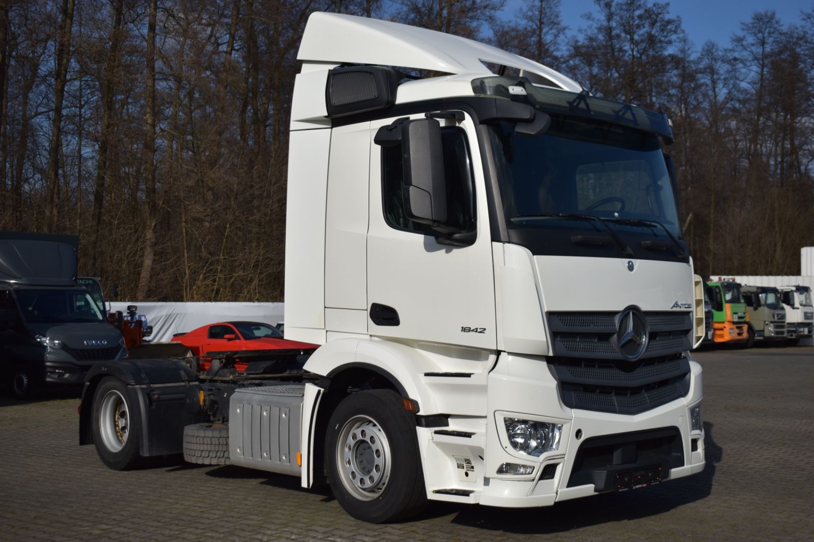 Mercedes-Benz Antos 1842 LL/ClassicSpace, 2xTank, climate control, ACC, Euro 6. Cabin: ClassicSpace, 2x tank, full covering, lane departure assistant, air conditioning, suspension: air, cruise control, electric heated outside mirrors, autonomous emergency braking assistant (Active Brake-Assist 5), rear axle differential lock, auxiliary heater, multifunction steering wheel, tire pressure monitoring system, upholstery: driver’s seat velvet, comfort locking system, electric windows, electric sunshade for windshield and sleeper cab. Special features: driver’s side airbag, work lights, audio system: CD radio (Bluetooth), air connection in the cabin, air horn, brake assistant (Active Brake-Assist 3), automatic climate control, combined tank aluminum – 660 ltr. diesel + 75 ltr. urea solution (AdBlue), air intake behind cabin, roof air deflector (lockable) and side, mounting plate for fifth wheel coupling, intensified engine brake, tire pressure monitoring system, side spare wheel lift, lower sleeping berth, circuit breaker, cabin seats: passenger seat with armrest, driver’s seat comfort, driver’s seat backrest foldable, external sun visor, side window sunshade, driver’s door, 24V socket in passenger footwell additionally, additional thermal insulation, additional heating (water). Further specifications: emission standard EURO 6, axle configuration: 4×2, front axle load 8.0 t, 24V / 15-pin trailer socket, Antos, exhaust to the right outside, electric heated mirrors, battery 170 Ah, rear axle differential lock, steel air tank, medium air unit, cabin width 2.30 m, hydraulic tilting mechanism, M ClassicSpace cabin, steel-spring cabin, standard, reinforced (Sweden), cabin floor with engine tunnel 170 mm, suspension: air, electric windows, tinted windscreen, generator 100 A, 12-speed transmission: type G 211-12, 12-speed transmission: type G 281-12, manual lifting roof (steel), rear axle crown wheel 440, info-display 10.4 cm, integral rear, body/type: tractor unit, comfort locking system, 3-part fender, fuel tank: 390 ltr. aluminum, unregulated steering aid pump, engine 12.8 ltr. – 310 kW R6 diesel (OM 471), engine compartment encapsulation, wheelbase 3700 mm, ramp mirrors, spare wheel, residual heat utilization, manually lubricated fifth wheel coupling, disc brakes on front and rear axles, seat cover/upholstery: fabric, cabin seats: passenger functional seat, front splash guard, cabin 24V socket, tachograph/EC control device, aerodynamically shaped underbody covering, front underrun protection, preparation for toll collection, offset front axle, regulated water pump, permissible total weight 18,00 t. General condition: mechanically, engine, transmission flawless. German vehicle, German documents. Top condition. Inspection book available. Mileage: 374,000. TÜV: 01/2026. Dimensions: height: 3694 mm, length: 6157 mm, width: 2550 mm, wheelbase: 3700 mm. Weight: permissible total weight: 18,000 kg, empty weight: 7,871 kg, payload: 10,129 kg. Tires: front axle: 355/50 R22.5 154/G (90%), rear axle: 315/60 R22.5 145/G (90%).