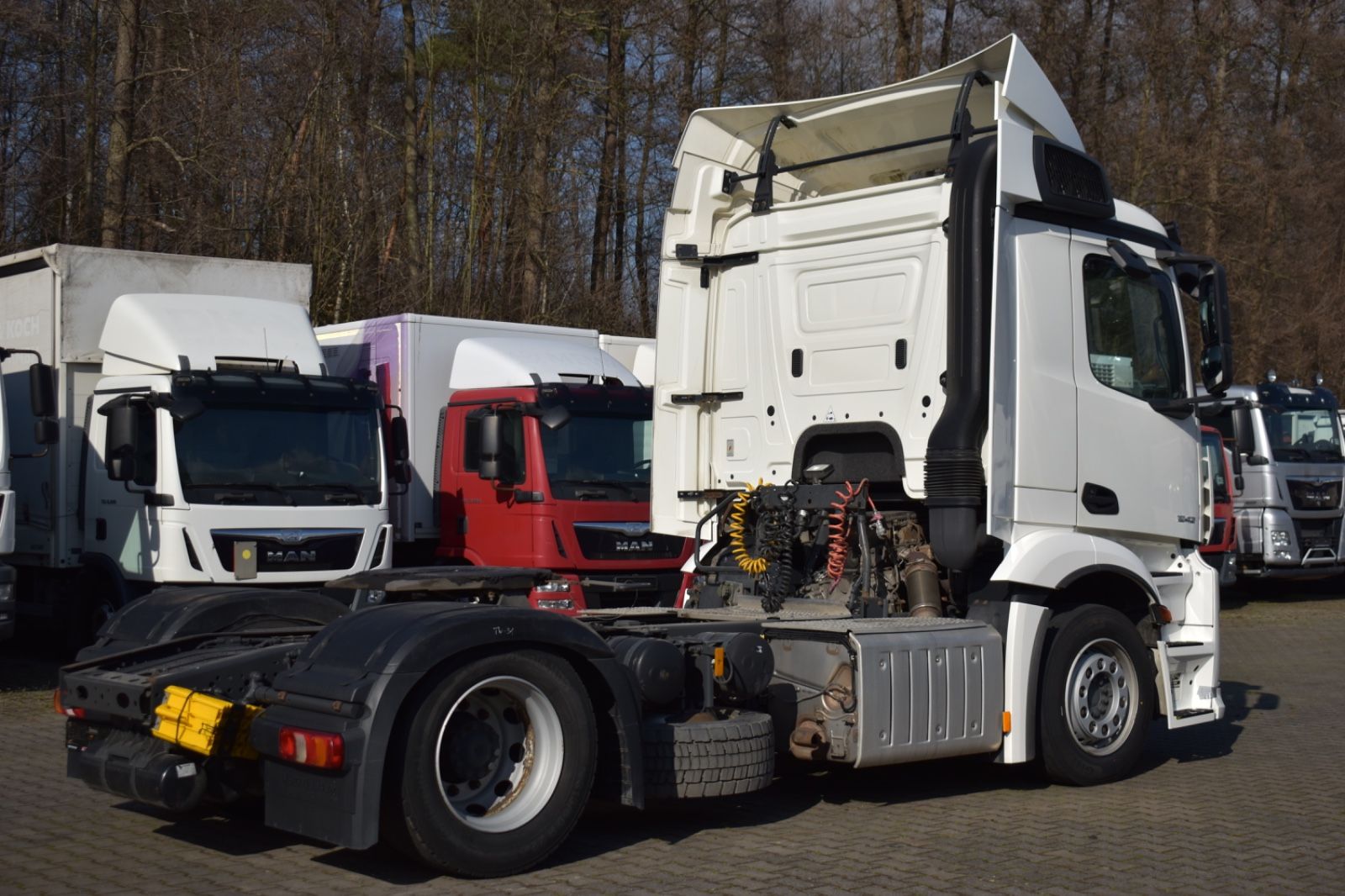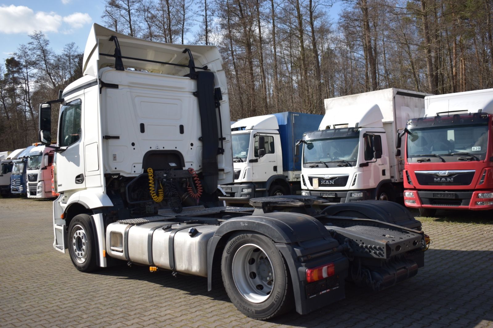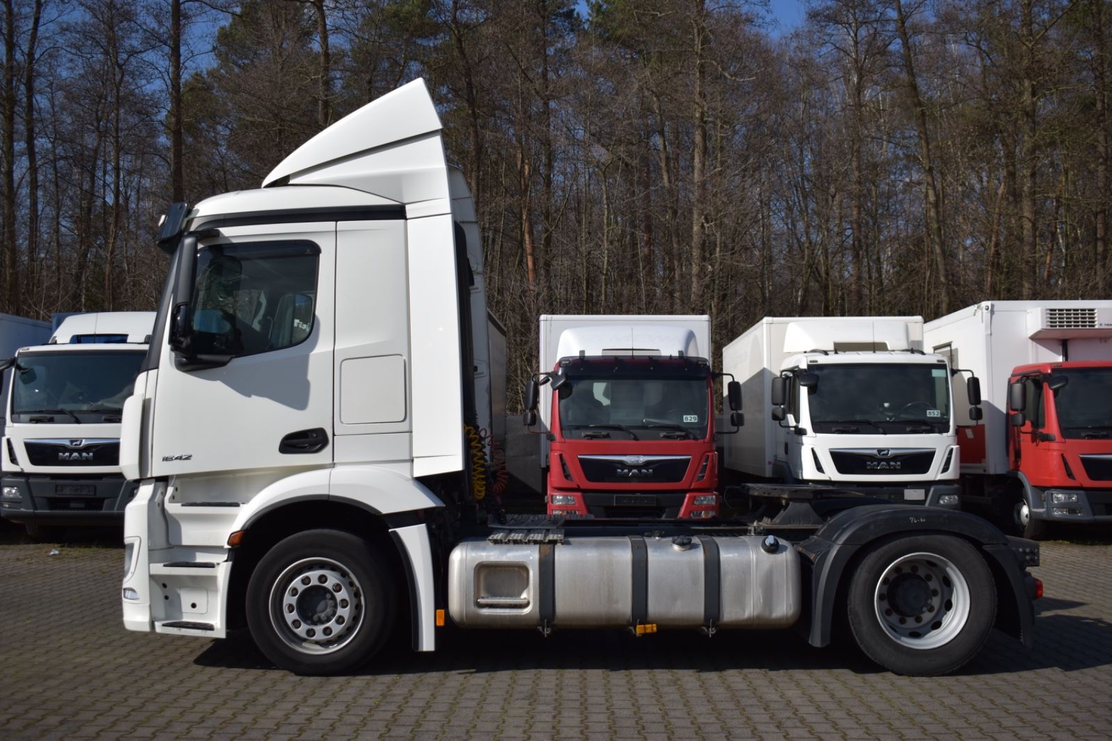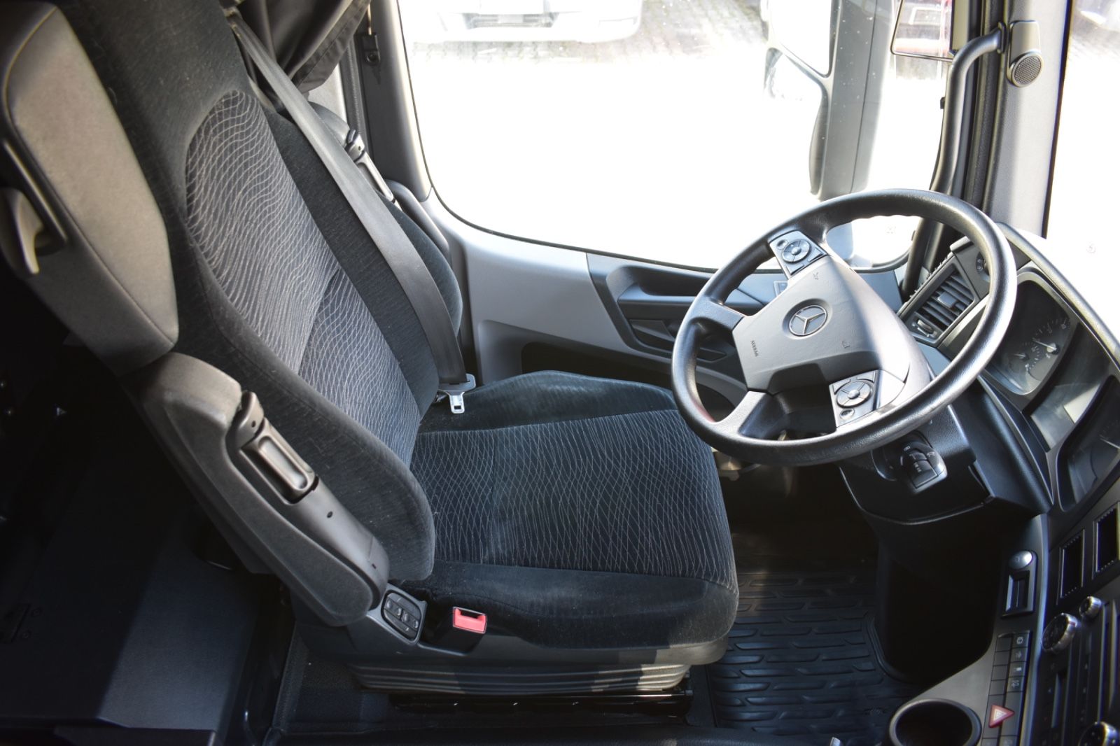 Mercedes-Benz Antos 1842 LL/ClassicSpace, 2xTank, climate control, ACC, Euro 6. Cabin: ClassicSpace, 2x tank, full covering, lane departure assistant, air conditioning, suspension: air, cruise control, electric heated outside mirrors, autonomous emergency braking assistant (Active Brake-Assist 5), rear axle differential lock, auxiliary heater, multifunction steering wheel, tire pressure monitoring system, upholstery: driver’s seat velvet, comfort locking system, electric windows, electric sunshade for windshield and sleeper cab. Special features: driver’s side airbag, work lights, audio system: CD radio (Bluetooth), air connection in the cabin, air horn, brake assistant (Active Brake-Assist 3), automatic climate control, combined tank aluminum – 660 ltr. diesel + 75 ltr. urea solution (AdBlue), air intake behind cabin, roof air deflector (lockable) and side, mounting plate for fifth wheel coupling, intensified engine brake, tire pressure monitoring system, side spare wheel lift, lower sleeping berth, circuit breaker, cabin seats: passenger seat with armrest, driver’s seat comfort, driver’s seat backrest foldable, external sun visor, side window sunshade, driver’s door, 24V socket in passenger footwell additionally, additional thermal insulation, additional heating (water). Further specifications: emission standard EURO 6, axle configuration: 4×2, front axle load 8.0 t, 24V / 15-pin trailer socket, Antos, exhaust to the right outside, electric heated mirrors, battery 170 Ah, rear axle differential lock, steel air tank, medium air unit, cabin width 2.30 m, hydraulic tilting mechanism, M ClassicSpace cabin, steel-spring cabin, standard, reinforced (Sweden), cabin floor with engine tunnel 170 mm, suspension: air, electric windows, tinted windscreen, generator 100 A, 12-speed transmission: type G 211-12, 12-speed transmission: type G 281-12, manual lifting roof (steel), rear axle crown wheel 440, info-display 10.4 cm, integral rear, body/type: tractor unit, comfort locking system, 3-part fender, fuel tank: 390 ltr. aluminum, unregulated steering aid pump, engine 12.8 ltr. – 310 kW R6 diesel (OM 471), engine compartment encapsulation, wheelbase 3700 mm, ramp mirrors, spare wheel, residual heat utilization, manually lubricated fifth wheel coupling, disc brakes on front and rear axles, seat cover/upholstery: fabric, cabin seats: passenger functional seat, front splash guard, cabin 24V socket, tachograph/EC control device, aerodynamically shaped underbody covering, front underrun protection, preparation for toll collection, offset front axle, regulated water pump, permissible total weight 18,00 t. General condition: mechanically, engine, transmission flawless. German vehicle, German documents. Top condition. Inspection book available. Mileage: 374,000. TÜV: 01/2026. Dimensions: height: 3694 mm, length: 6157 mm, width: 2550 mm, wheelbase: 3700 mm. Weight: permissible total weight: 18,000 kg, empty weight: 7,871 kg, payload: 10,129 kg. Tires: front axle: 355/50 R22.5 154/G (90%), rear axle: 315/60 R22.5 145/G (90%).