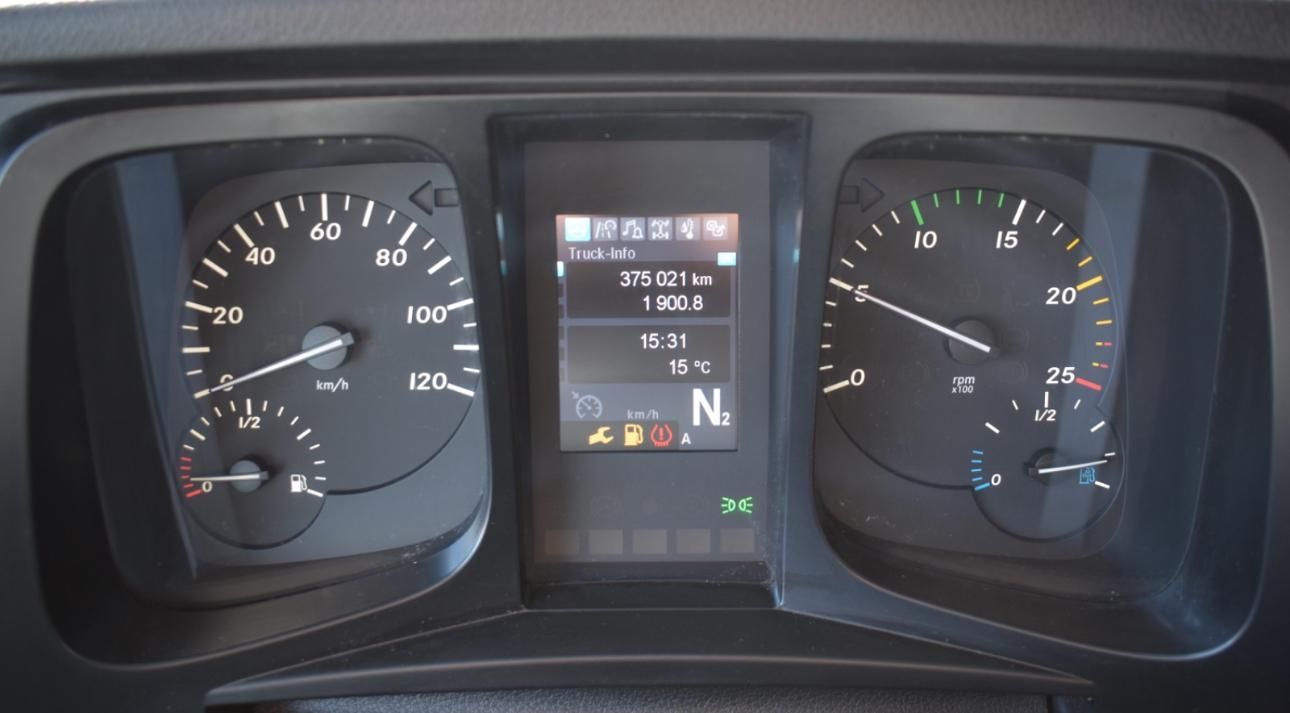 Dimensions: Height: 3694 mm, Length: 6157 mm, Width: 2550 mm, Wheelbase: 3700 mm. Weight: Total permissible weight: 18,000 kg, Empty weight: 7,871 kg, Payload: 10,129 kg.
